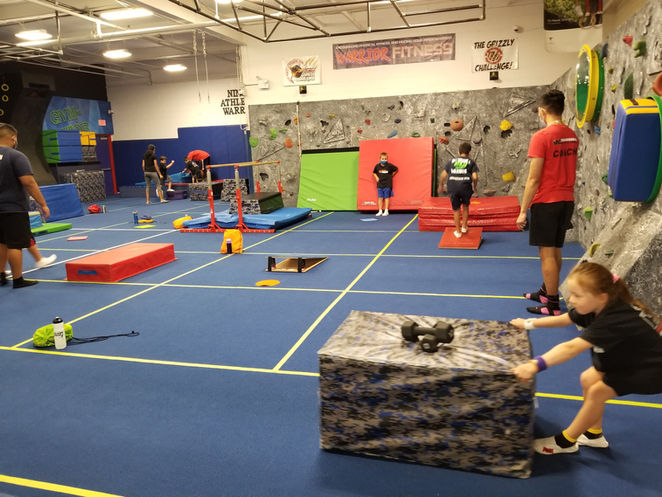 Our Ninja Warrior gym is boxed into 6x6 squares to enforce social distancing. Each child gets their own box or row depending on the activities assigned for the week.